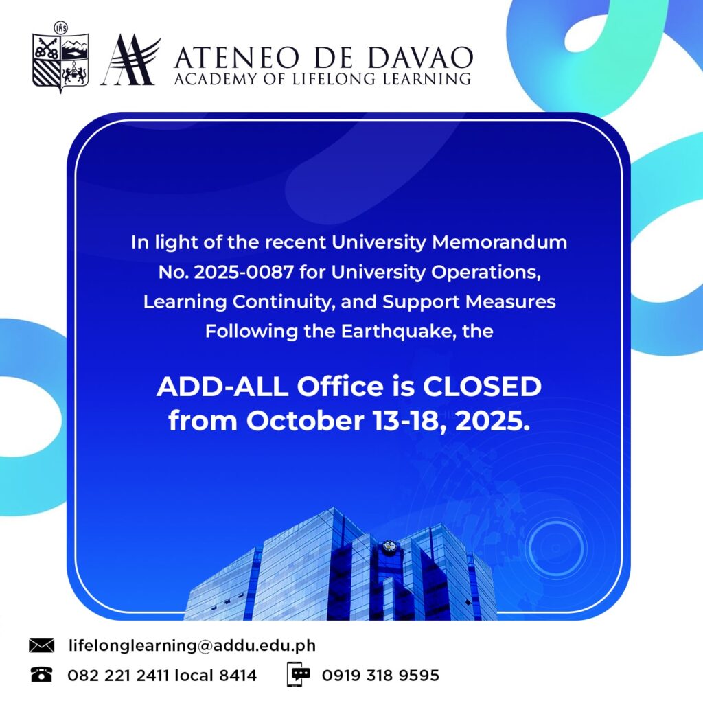 That said, we will be carrying out our operations online while repairs are underway. Please feel free to message us here or email us at courses.lifelonglearning@addu.edu.ph for any inquiries or concerns. You may also text us at 09193189595.